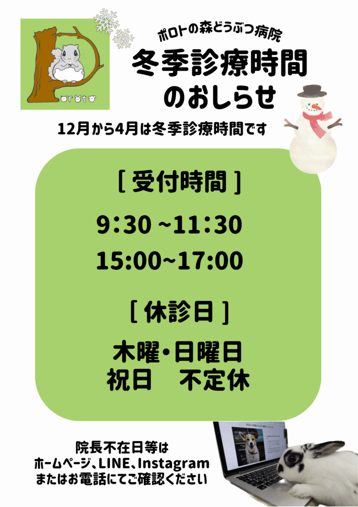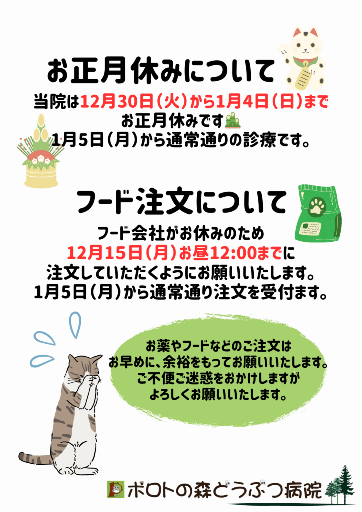 冬季のお知らせ 2025.12.06 Share LINE note 冬季診療時間について お正月休みとそれに伴うフード注文締め切りについて ご不便ご迷惑をおかけしますがよろしくお願いいたします。 Share LINE note この記事のタイトルとURLをコピーする お盆休み&フード注文について 前の記事